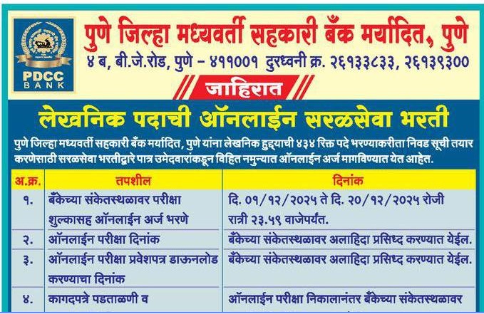 - PDCC Bank Bharti 2025 : पुणे जिल्हा मध्यवर्ती सहकारी बँक भरती